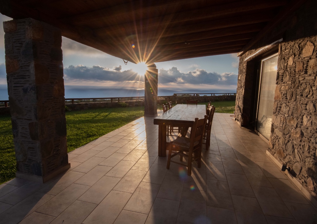 An open terrace and  veranda  with a magnificent view on an ample stretch of the Cretan Sea, with its breathtaking sunsets and, in the night, a million stars appearing just when the jasmine starts to spread its sweet fragrance.  A friendly and cozy fireplace for the colder season.